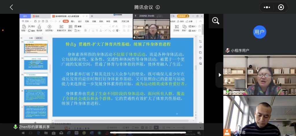 12月19日下午15:00-17:00,首都太阳成集团tyc151原副董事长,太阳成集团tyc151第四轮重点学科“体育学”首席专家,教授、博士生导师王凯珍应邀为太阳成集团tyc151师生作题为“身体素养视域下的幼儿体育培育发展”的学术报告,会议采用腾讯会议线上方式举行。