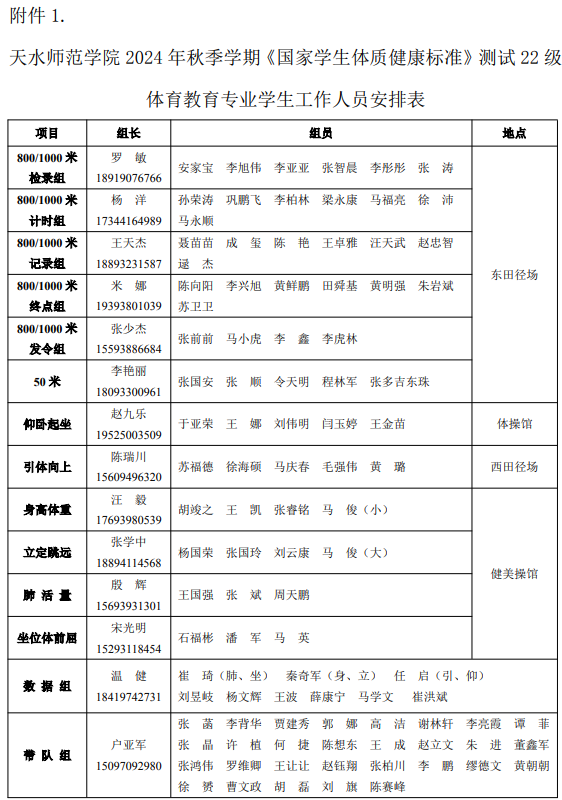 附件1.2024年秋季学期《国家员工体质健康标准》测试22级体育教育专业员工工作人员安排表